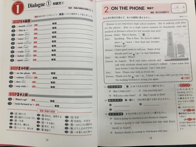 選択問題や日本語訳を書いて、理解を深める教材です。