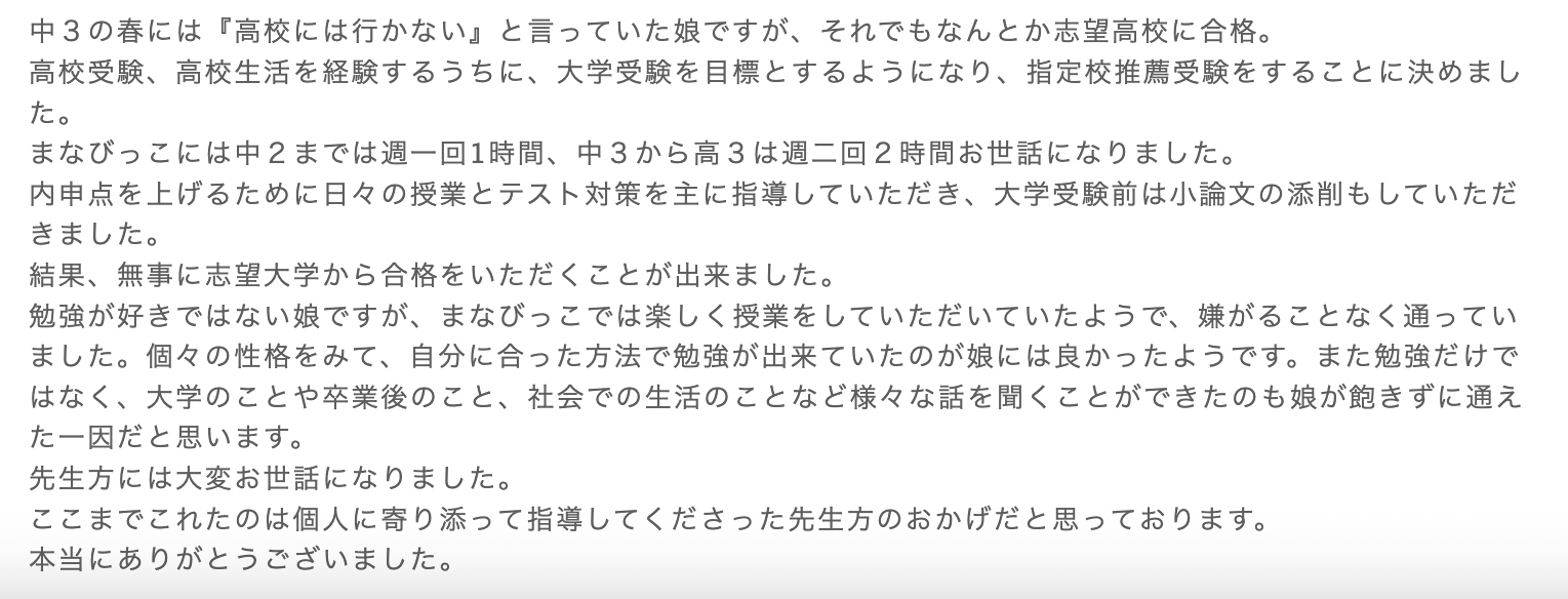 まなびっこで将来が開けた、とおっしゃって頂いた親御さん